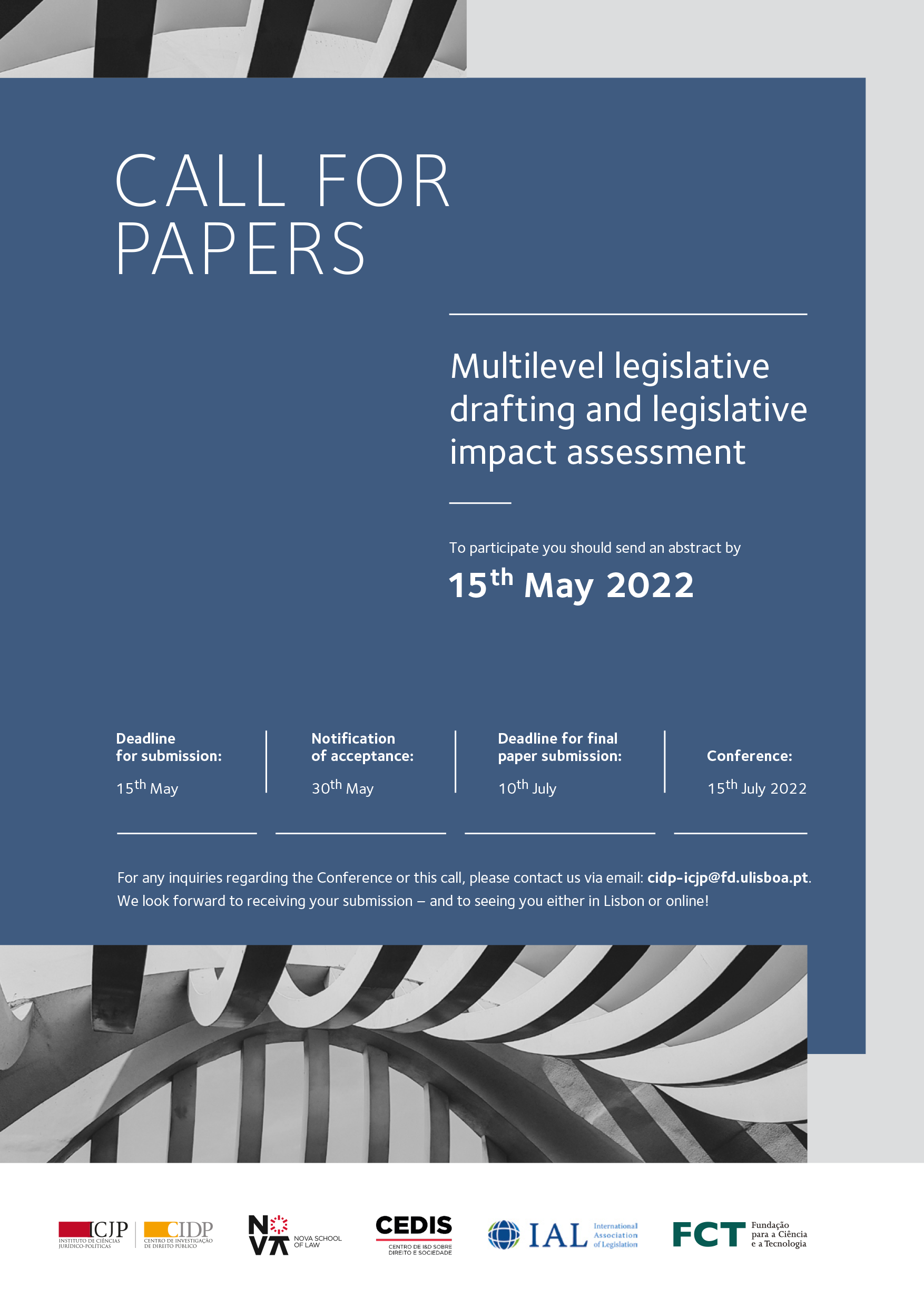 The University of Lisbon School of Law, Nova School of Law, and the International Association of Legislation (IAL) are pleased to announce the International Conference on "Multilevel Legislative Drafting and Legislative Impact Assessment", within the scope of the ‘LegImpact Project PTDC/DIR-OUT/32353/2017 – Legislative production as a means of carrying out public policies: quantitative analysis and socio-economic impact’, that will be held in hybrid format in Lisbon, on 15 July 2022.