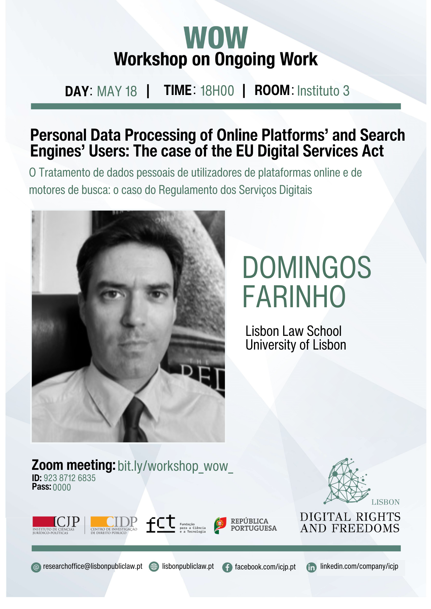 O evento WOW deste mês, será conduzido pelo Investigador Responsável do Projecto "Digital Rights and Freedoms", o Professor Domingos Farinho que nos trará o tema "O Tratamento de dados pessoais de utilizadores de plataformas online e de motores de busca: o caso do Regulamento dos Serviços Digitais"